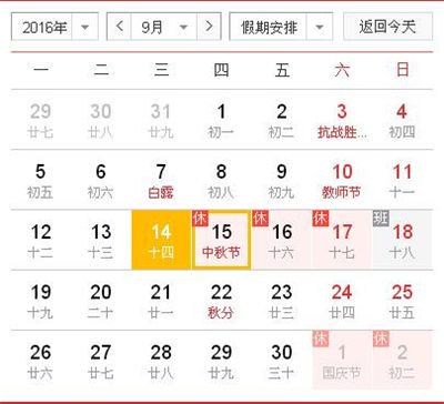 根據(jù)《國務(wù)院辦公廳關(guān)于2016年部分節(jié)假日安排的通知》和省政府辦公廳有關(guān)通知精神,2016年中秋節(jié)放假日期具體安排如下:9月15日至17日放假調(diào)休,共3天。9月18日(星期日)上班。